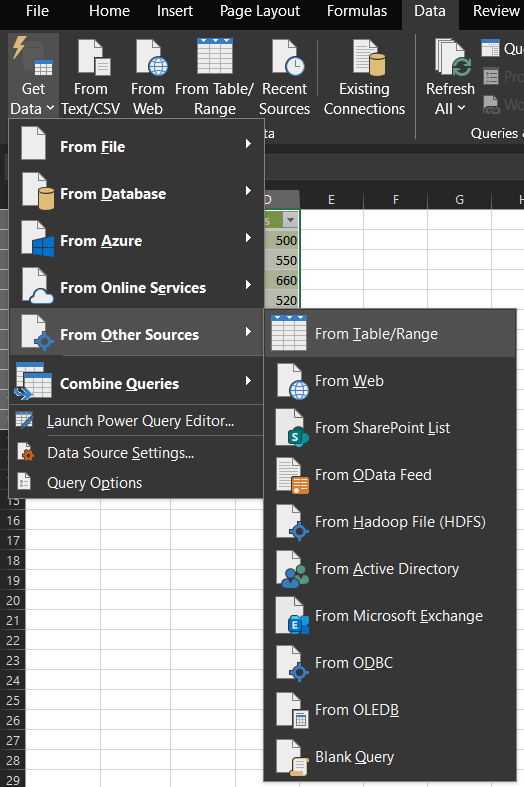 - Go to Data > Get & Transform Data > From Table/Range.